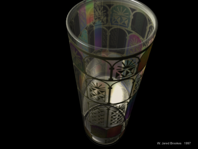 A 3D re-creation of a real-world glass. This was more of a texturing exercise than anything else. LW 5.0 (WJB, 1997). |