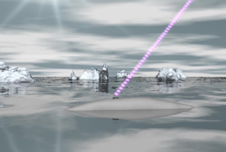 The Beluga whale documentary again. The whales are tracked by satellite. This shot shows the signal being transmitted (LightWave 3D, 1997). |